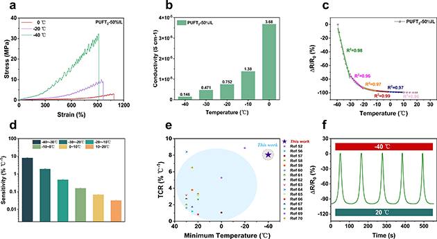 針對(duì)極地等極端環(huán)境的挑戰(zhàn),團(tuán)隊(duì)重點(diǎn)測(cè)試了材料的低溫耐受性。在-40℃時(shí),材料仍能保持較高的強(qiáng)度、韌性、可拉伸性和離子電導(dǎo)率。此外,該材料表現(xiàn)出負(fù)溫度系數(shù)行為,在-40℃至-30℃超低溫區(qū)間的溫度系數(shù)電阻高達(dá)8.05% ℃-1,且在連續(xù)熱循環(huán)測(cè)試中表現(xiàn)出良好的穩(wěn)定性和可重復(fù)性,彰顯了其在深冷環(huán)境下可靠應(yīng)用的潛力。